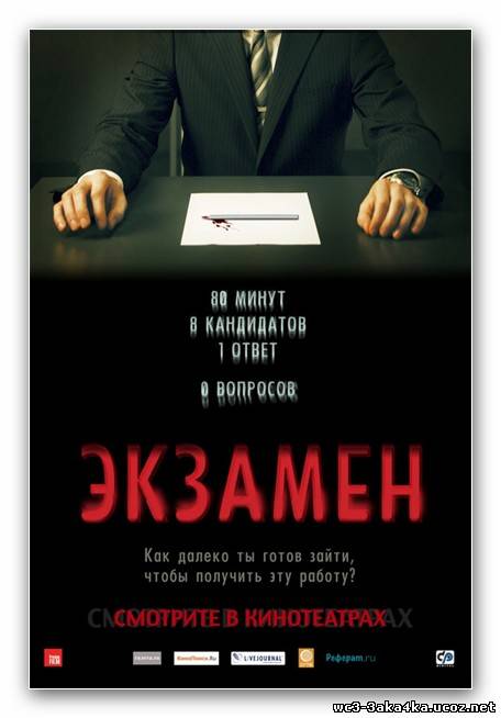 О фильме: Восемь претендентов пытаются получить работу своей мечты. Но вакансия всего одна. На пути к заветной должности они уже преодолели массу испытаний. Остался последний экзамен. Он проходит в изолированной комнате под присмотром вооруженной охраны. За 80 минут 8 человек должны ответить на 1 вопрос. Условие: нельзя портить бумагу, на которой он написан. Время пошло! Первый шок: на листках ничего нет. На какой же вопрос надо ответить? Один из кандидатов начинает писать: «Думаю, вы должны нанять меня потому, что…» Первая ошибка! Бумагу портить нельзя. Девушку удаляют из комнаты. Оставшиеся пытаются решить проблему вместе. Впереди испытание водой, огнём и ненавистью.Фильмы | Просмотров: 624 | Дата: 28.02.2011 |