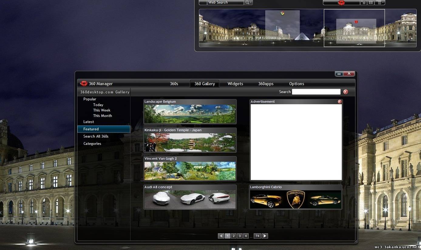 С помощью утилиты 360Desktop можно создать панорамный по горизонтали рабочий стол. Рабочее пространство можно вращать (передвигать, скроллить) в обе стороны как из основного окна программы, так и при помощи мыши, передвинув курсор на край рабочего стола.