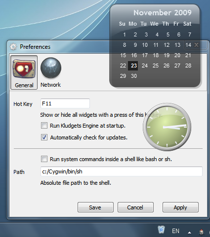 Kludgets – программа для запуска «кладжетов» - виджетов рабочего стола, похожих на гаджеты Windows 7, виджеты Opera, Yahoo и MacOS X. Кроме собственных мини-приложений, программа полностью поддерживает виджеты Opera, использует движок WebKit и соответственно поддерживает HTML5.