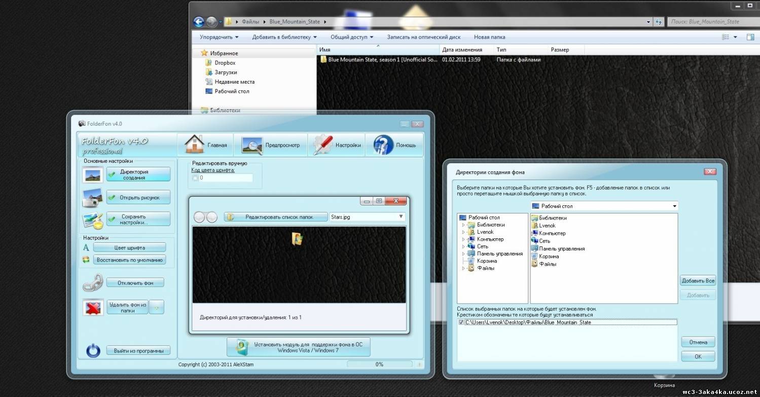 FolderFon – довольно неплохая программа с интуитивным понятным и приятным на вид интерфейсом, предназначенная для замены фона в папках, помимо этого также можно настроить и цвет шрифтов, и предварительно посмотреть как будет выглядеть оформленная папка.