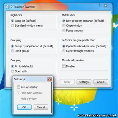 7 Taskbar Tweaker – это интересная утилита которая позволяет настроить манеру поведения панели задач Windows 7. В частности настроить действия кликов левой, правой и средней кнопками, а так же группировку и открытие окон, что может быть удобно в определенных случаях. Собственно весь функционал утилиты вы можете оценить всего лишь взглянув на скриншот. Настройки утилиты минимальны, поскольку позволяют только поставить автозапуск, либо убрать значок из трея. Корректная работы утилиты гарантируется при запуске от имени администратора. Программа не требует установки, в архиве находятся версии как для 32х битных систем, так и для 64х битных.