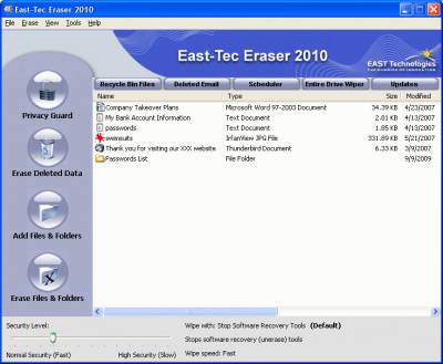 Защитите свою информацию удаляя все события с вашего компьютера, а также историю онлайн активности при помощи программы East-Tec Eraser 2011. Программа удалит все следы вашей работы за ПК, электронные письма, которые были удалены, сотрет следы ввода флеш-накопителей, дискет, дисков CD/DVD.